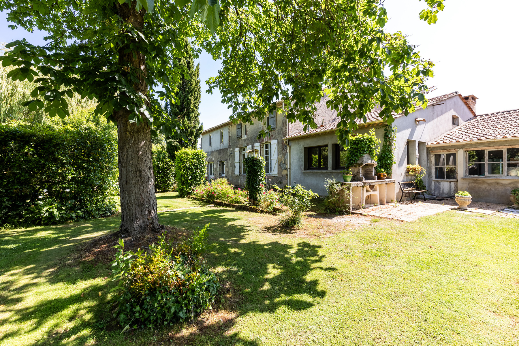 Enfin, ce cadre bucolique de plus d'un hectare de jardins magnifiquement fleuris, d'un jardin potager de rêve, d'un parc arboré soigneusement aménagé, invite à la détente et à la convivialité avec sa végétation luxuriante et ses jardins intimistes. Vous pourrez vous promener à votre guise dans les allées et pelouses de la propriété, vous ressourcer en compagnie de vos petits animaux (actuellement quelques poules), vous reposer au pied de chênes centenaires ou encore flâner dans les 10000 m2 de jardins et parc entourant la longère et la grange.
